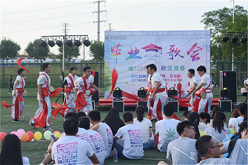 嗨歌会伊始,身穿表演服、扎着红绸带的一群帅小伙儿们带来的腰鼓表演瞬间将现场的气氛点燃,俊美热情的主持人在大家的欢呼声中登场。赵延安书记在致辞中表达了对毕业生真诚祝福,希望每一位2017届毕业生都有一个圆满的归属,并预祝本次活动圆满成功。