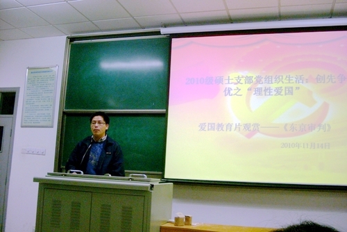 11月14日晚,为弘扬爱国主义精神,激发党员的爱国热情和教育党员理性表达爱国情怀,经管学院2010级硕士生一、二、三支部联合开展了以“创先争优之理性爱国”为主题的党组织生活,并集体观看爱国教育影片《东京审判》,以特殊方式集体抒发爱国情怀。全体党员及入党积极分子100余人参加活动,学院党委委员夏显力副教授应邀出席了活动。