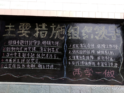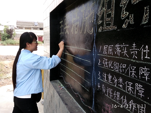 为深入学习贯彻习近平总书记系列重要讲话精神,推动全面从严治党向基层延伸,党中央决定开展“学党章党规,学系列讲话,做合格党员”学习教育,为了进一步宣传两学一做的内容及意义,4月23日,村主任助理李华、白瑀在崔西沟开展板报宣传活动。