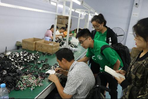 调研队成员向工作人员学习如何加工零件,体验他们的工作。