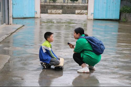 调研队成员正在和孩子聊天。在这个环境简单的工厂,孩子们能找到的玩具也只有沙包和滑板。