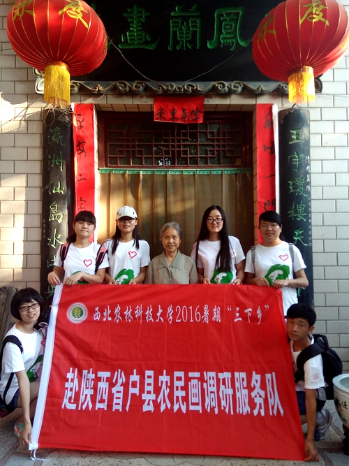 户县西韩村地处要塞,天蓝水清,民风淳朴,广聚人气。为了更进一步地探索农民画的一系列问题,8月3日,赴陕西户县农民画调研服务队前往户县的西韩村拜访著名农民画画家李凤兰。