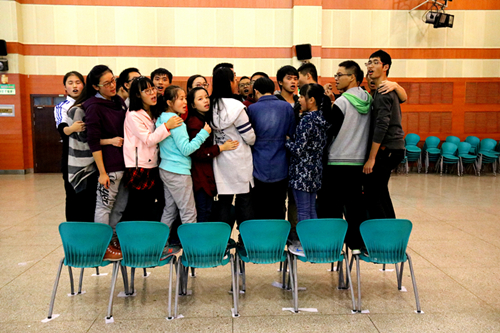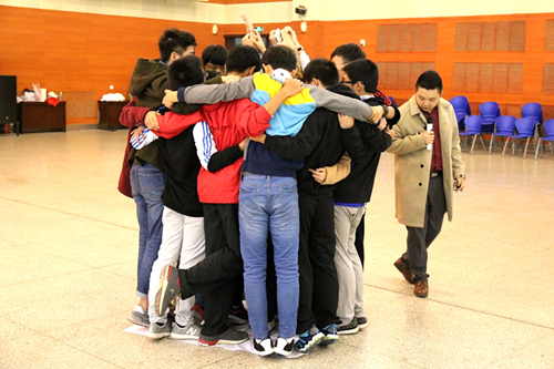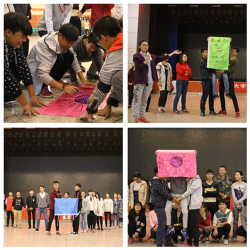第一天的训练在北绣山活动中心大厅开展,活动采用“户外体验式”教学方法,从破冰游戏“雨点变奏曲”开始,考验学生的注意力和应变能力。随后,来自各个学院的营员分为四组,选出各队队长并设计队名、队徽、队呼、队歌,通过热身游戏迅速建立团队成员之间的信任,共同完成“我们是最棒的”、“六元五角”、“翻扑克”等游戏任务。在妙趣横生的体验环节中,随着活动进程的慢慢推进,大家的默契也越来越足,同学们热情高涨,气氛活跃,众人拾柴火焰高,一路探索,一路进步,收获乐趣同时更增强了团队的凝聚力。