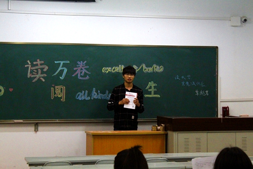 “设立‘世界图书日’的目的是推动更多的人去阅读和写作,希望所有人都能尊重和感谢为人类文明做出过巨大贡献的文学、文化、科学、思想大师们,保护知识产权。”林学1504班的班长正在向大家介绍“世界图书日”。并且以此为基础向我们介绍种类繁多的书籍,接着同学们开始分享自己在读书中得到的收获和乐趣。图书的种类之多我们无法想象,最重要的是找到你所热爱的,享受其中的乐趣,那么你才能真正的爱上读书。