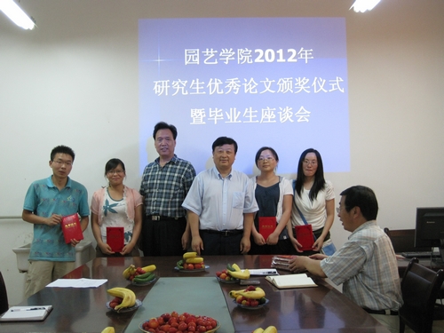 6月21日下午,园艺学院2012年研究生优秀学位论文颁奖仪式暨毕业生座谈会在学院会议室举行。学院党委书记肖斌、院长邹志荣出席会议,研究生秘书、2012年优秀学位论文获得者及毕业研究生代表参加了座谈会,会议由副院长马锋旺主持。