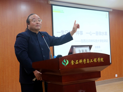 讲座过程中,余惠勇高度赞扬了我校自主研发的苹果品牌“瑞雪青青果”,并表达了想与我校合作的意愿,希望更多的西农学子加入百果园!