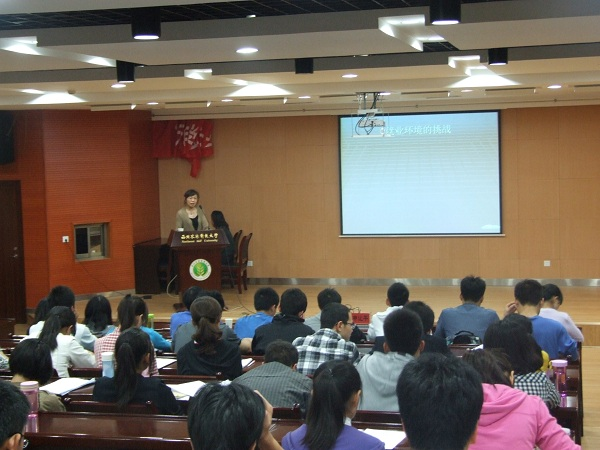 金宏宇首先将同学们的毕业去向做了吸引力排序,解读了当代大学生追求稳定、高薪的就业心理,指出了当代青年面对的购房、养家等方面生存压力,以及 “私企招工难、学生就业难”的社会现状。结合社会现实,她认为随着国家与社会的进一步发展,稳定的工作岗位将会进一步减少,私营企业将更多地成为同学们的毕业选择。她希望同学们在应聘时准确定位,正确的审视自我,并积极进行换位思考。