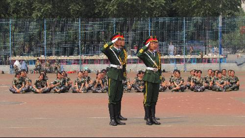 趁着休息时间,几个学生赶忙围在护卫队员周围,就护卫队选拔、训练等方面进行咨询。王梓丞围绕护卫队训练时间、地点以及基本内容,耐心地为大家解答:“一般在国旗路上练习基本的动作要领;树基路上有台阶,我们就借此练习腿部力量,没有特殊原因,风雨无阻。”最后,他热心地欢迎新生们参加咨询会,对国旗护卫队做进一步了解。“从田径场到旗杆,一共1031步,这个精确数字是靠汗水打磨出来的。”队员们不畏艰辛、刻苦训练的精神深深打动了同学们,他们纷纷表示,要向队员们学习,克服天气炎热、训练艰苦的困难,早日完成训练目标。