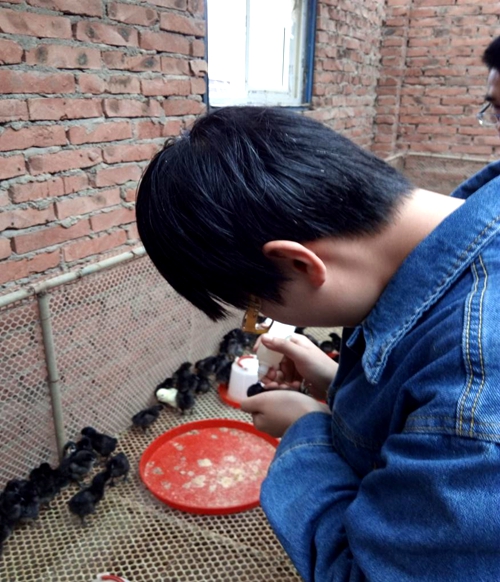 中午一点,正值烈日,但志愿者们毫无怨言一起骑车到达目的地。约两点,大家进入合作社,合作社负责人张华锋与我们进行了交谈,针对我们能做的与合作社需要的进行了交流。由于当天合作社需要的人数不多,便有3位田园使者留在了合作社为5-7日龄的1000只小鸡和约70只鸭子进行了新城疫和传染性支气管炎疫苗接种。整个接种活动中,三位志愿者在31摄氏度左右的孵化室以滴鼻的方式为小鸡和鸭子进行了防疫,大约持续3个小时将所有的小鸡和鸭子接种完毕并转入了育雏室。