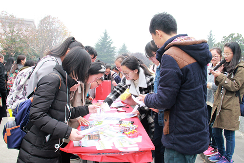 活动开始之前,工作人员早早来到现场进行场景布置,铺置签名条幅,摆放奖品,检查问题字条。每一位工作人员都在有条不紊的进行着活动的准备工作。一切工作准备就绪后,工作人员在路上向过往同学介绍理性消费,创意维权的重要性,并邀请同学们到现场签名和答题,使其参与到宣讲活动中去。活动中,工作人员耐心的回答同学们有关理性消费主题的相关问题。宣讲人也充满了热情,宣讲词十分幽默,吸引了更多的同学前来参加。同学们抽到写有题目的纸条后,积极讨论,认真思考,给出自己的答案。约一个小时后,活动圆满完成。
