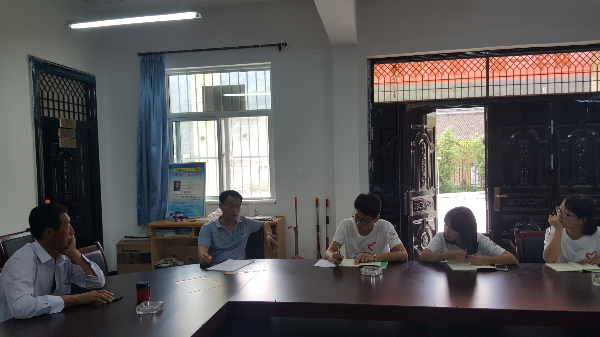 按照行程安排,队员们下午来到太白县政府,由于周末不上班,于是队员们只好拨打了县政府的电话,一位姓叶的职员出来接待了同学们,解释说由于太白举办物资交流会,工作人员都到一线去了并帮同学们找了民政局老龄办的联系方式。事后,还热情的给队员们介绍来了交流会期间的一些活动安排。当得知队员们打算前往上白云村进行实地走访时,又帮助队员们联系了当地村委会。