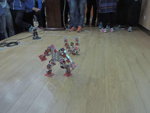 随后,各参赛组的队员们上台与同学们分享了比赛经验。仿人竞速组的孙丰瑞同学用一张张照片生动地为我们展示了他们的比赛经历。在分享自己比赛和平时学习的经历时,学长表示“痛并快乐着”,其间他们遇到过很多的问题,包括程序编写、舵机的选择和调试等等,几欲放弃,但作为科研工作者,坚持不懈的精神促使他们继续下去,最终尝到了成功的喜悦,他说道“高数考满分也比不上得奖时的喜悦”。