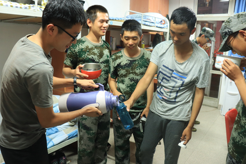 持续的降雨导致很多学生患了感冒,学生干部们便积极联系食堂煨制姜汤,并纷纷拿出个人及宿舍的暖瓶盛装姜汤。在喝到姜汤之后,生物1707班的王启民说道:“姜汤很暖,学长学姐们也很暖,感觉像在家里。”组织发放姜汤的是学生会主席窦俞莹,在被问到“暖心工程”时说道:“为同学服务,不能只停留在口号上,这是我们的宗旨,必须付诸实实在在的行动,必须盯紧同学们的生活之需、成长之需。希望大一的学弟学妹们能够开心的度过军训时光。”