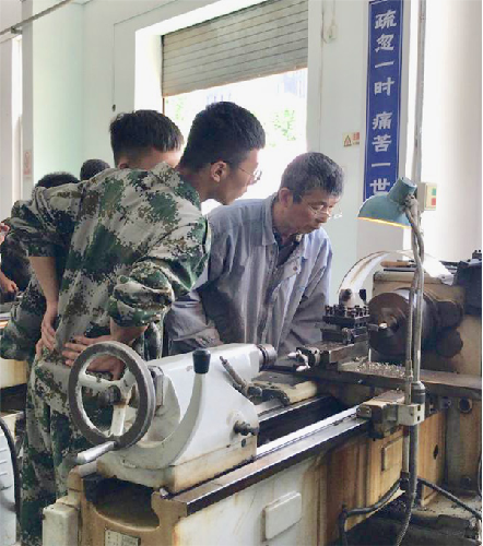 实训期间,我们经常攀谈。有一次,我尝试询问他的年龄,张师傅很干脆地回答了,却着实吓我们一跳,接着便是满满的敬意。张师傅1947年生人,现已七十一岁高龄,是在岗年龄最大的高级技术工人。但是,张师傅在为我们示范操作时,却丝毫没有显露出因岁月而消磨的痕迹。他拧螺母时刚劲又有力,转床轴时迅捷且精准。没有人会相信,面前这位硬朗矍铄的师傅已年过七旬,熟练地操作着笨重死板的车床。他灵巧的双手仿佛是在变戏法,当我们还在尝试着记住每一步的要领时,他已将一根铁柱毛坯削成形。