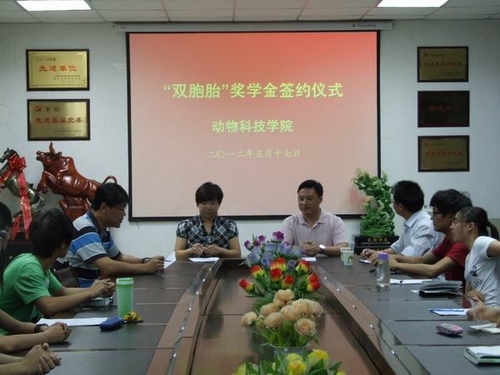 5月17日晚,动科学院举行“双胞胎”奖学金签约仪式暨学生就业实习基地签约仪式,标志着动科学院企业类奖助学金再创新高,达到9项。双胞胎(集团)股份有限公司咸阳分公司总经理刘全永、双胞胎(集团)人力资源中心经理张胜平、学院副院长兼副书记王晓娟、专兼职辅导员及部分学生代表参加了签约仪式。