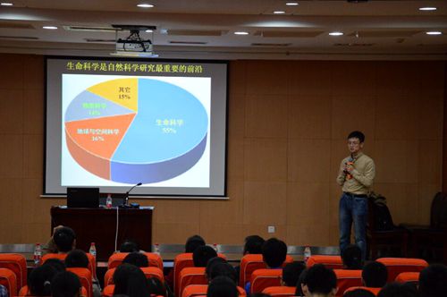 “萤火虫为什么会发光?金蝉是如何脱壳的?蚂蚁怎能合作搬家?”臧教授从自然界中的奇妙现象提出了“生命科学是自然科学研究最重要的前沿”,紧接着,就“只有地球上的生命吗?”、“意识是如何产生的?”、“人的寿命能有多久?”、“器官如何再生?”等近125个重要的自然科学前沿问题讲到人类少量基因数调控完成复杂生命活动进而到蛋白质的结构预测;从达尔文与拉马克的进化理论到遗传的中心法则;从卡尔·林奈的“怪物之花”再到“花相似,人不同”、“龙生龙,凤生凤”的遗传现象,最终揭示表观遗传现象调控的分子机制,都深深的吸引着在场所有学生。
