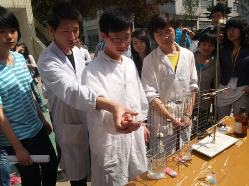 4月17日,由校团委主办,理学院承办的校园之春文化艺术节之趣味实验展示活动在理学院办公楼前举行。校团委副书记郭建东、理学院化学老师王林、余瑞金出席了活动。共有13组队伍参赛,有一百余名同学到场观看比赛。