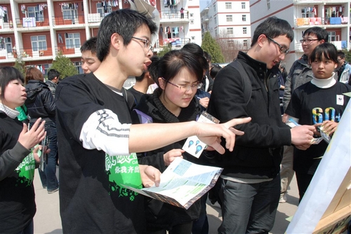 在北校区的活动现场人潮涌动,活动宣传板可以清晰的看到“1+1”与“我和我的低是碳伙伴”两大活动内容。据活动的负责人介绍,“1+1”主题是让同学们用实用的低碳小贴士将自己的名字留宣传板上,表明自己对低碳生活的支持;“我和我的低是碳伙伴”是让同学们在宣传板上贴上自己所做的一些关于低碳生活的事情,告诉大家节能减排的方法,提醒同学们节能减排要从小事做起,举手之劳就可以为之做出贡献。现场还有志愿者宣传“地球一小时”活动,倡议同学们在晚上8:30到9:30走出宿舍,体验黑夜大自然的呼吸,用自己的行动为地球减碳。