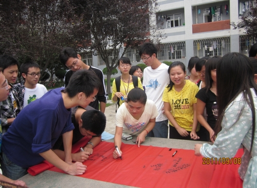 食品学院组织09级和10级的同学们在上课伊始,集体起立,向任课老师深鞠一躬,齐声道:“老师,您辛苦了!”他们还在宿舍楼前举行了以“谢师恩,写师情”为主题的横幅签名活动,同学们积极参加,将自己对老师满满的祝愿写在横幅之上。