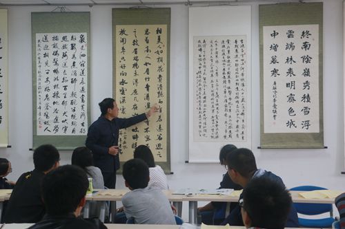 蒋老师首先向同学们提出了一个建议,“我们既然选择了书法,便需要修炼自己的气质,修养自己的品性,以前的粗俗的语言就不要讲了。”引得在场同学纷纷颔首。蒋老师紧接着强调了书法的几个要素,首先强调的就是印章,他打了一个比方,“如果有人找你写一个作品,你想委婉拒绝,你就说你没带印章。”由此表现印章在书法创作中的重要性。蒋教授还强调了书法是一种态度,“只有你全身心投入,把全部感情都倾注在书法里,你才能写出好字。”