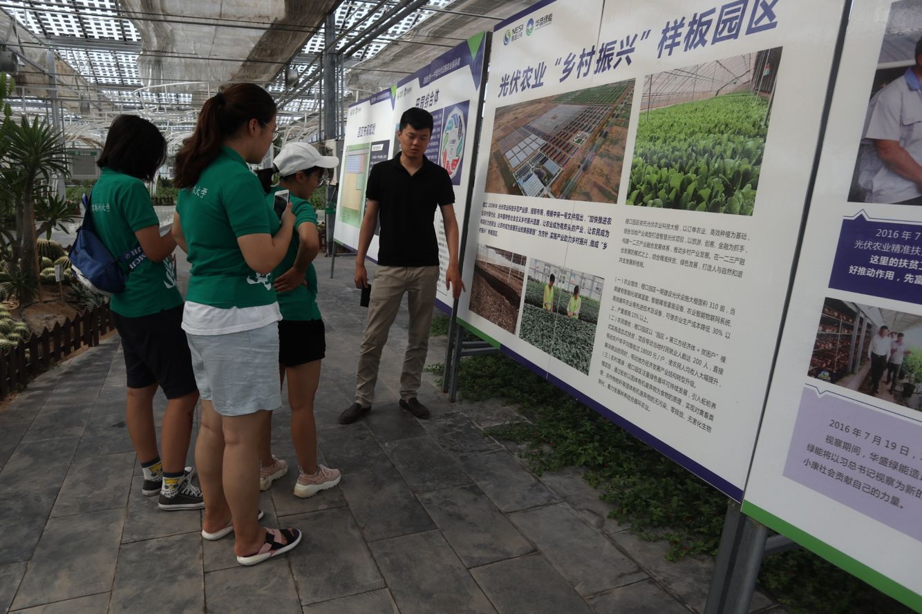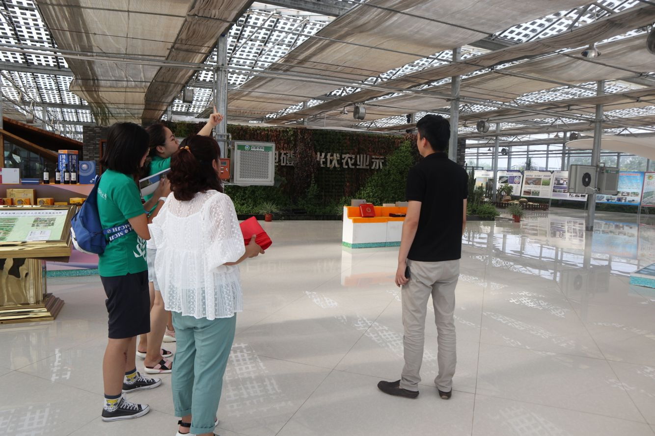 此次调研队来到的华盛绿能田园综合体以全农业产业链为基础,依靠清洁能源产业带动科技、创新,打造产业链、全绿色化、多功能化、高附加值、强竞争力的田园综合体示范。一进门,队员们就被大棚顶上的亮片吸引了,便连忙询问这是什么,负责人笑着说,“这就是我们的特色,棚上发电、棚下种植,这些亮片可以将太阳能转为电能,我们还在温室和大棚内种植花卉以及甜瓜等作物,并开展蚯蚓养殖,这些既提高了土地资源的利用率,也实现了多种产业的融合发展。我们企业要将'绿色'二字贯穿到底。”