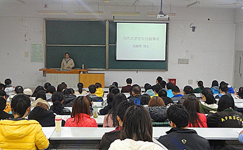黄庆荣博士首先了解了学生参加志愿者服务、义务支教活动情况,与学生进行了互动,采取“让同学谈体会、谈收获”、以身说教的形式鼓励大学生多参加社会公益活动。他以风趣幽默的语言指出当代大学生参加社会公益事业的意义和价值,传达了参与公益事业是令人身心愉快并锻炼自我的事情。