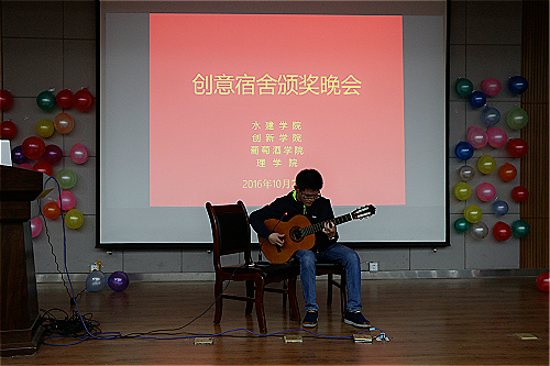 由水建学院水工153班徐嘉轩带来的精彩魔术表演拉开了本次大会的帷幕,随后,各获奖宿舍代表依次上台向同学们讲解自己的设计理念,用ppt展示自己的劳动结晶。丰富的创意,新颖的想法,出色的作品,精心编排的讲解,让现场观众们耳目一新。葡酒学院8#505宿舍,以文艺和音乐为主题,房顶的星空和墙上的音符无不给人一种曼妙的享受;水建学院12#518宿舍,星空与动漫结合,活跃在墙上的是目不暇接的动漫人物,抬头仰望的是一片浩瀚的星空;创新学院16#217宿舍,以充满绿色的春天主题赢得了台下的一片掌声。