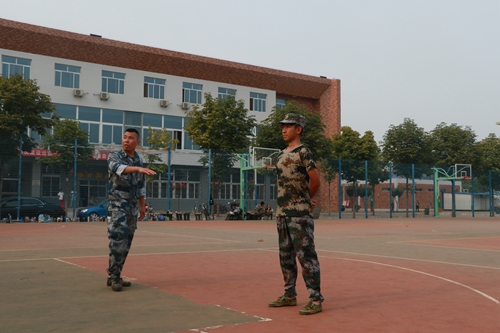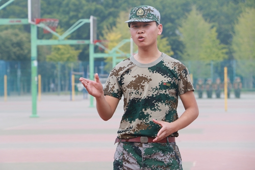 北校区篮球场上,我系连队迅速按照划分区域进行训练。教官依照学生身高对排面进行调整后,为受训学生讲解军姿、军服、军帽的正确规范标准。“都清楚了吗?”,“清楚了”。“我听不到”,“清楚了!”。“全体都有,立正!向右看齐!向前看!”一声声铿锵有力的问答声在操场上空回响,展示了我系新生们朝气蓬勃的精神面貌。
