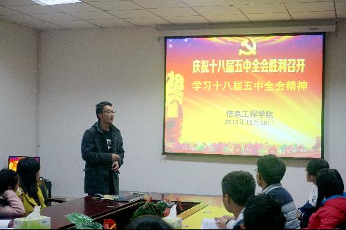 为深入解读十八届五中全会精神,信息工程学院于2015年11月10日晚在学院楼216会议室组织诸团支部团支书及各班班长开展“五中全会”精神学习研讨会。党艳东老师参加并主持会议。