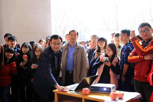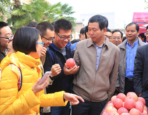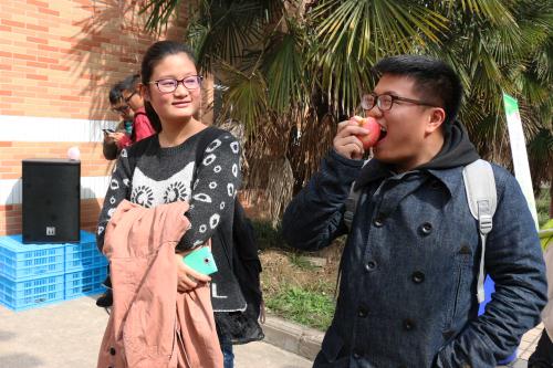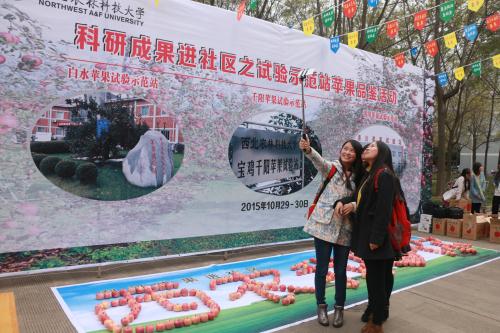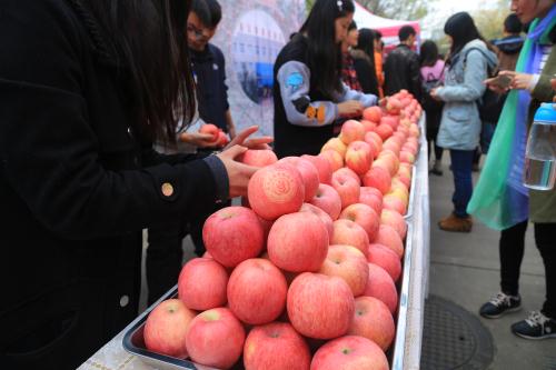 10月29日,期待已久的“科研成果进社区之试验示范站苹果品鉴活动”终于与同学们见面了,中午12点南苑餐厅门口熙熙攘攘的人群异常热闹:有拿着“苹果券”激动地等待领取的,有迫不及待拍照合影的,还有拿起苹果就大咬一口的。每个人脸上都洋溢着幸福和自豪,这种幸福和自豪连同苹果的美味迅速传遍“朋友圈”,传遍校园的每一个角落。