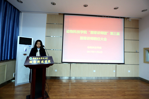 学工秘书胡巧娟首先对两年来学院朋辈辅导工作的发展及取得的成绩进行总结。学院从2015年开始,成立第一届“朋辈讲师团”仅20余名同学作为“朋辈讲师”,主要进行学业辅导,到今年第三届“朋辈讲师团”已吸纳到120余名同学,分设立学业发展组、创新创业组、升学深造组、素质拓展组及党员先锋组五个辅导小组,内容涵盖学业辅导、创新创业指导、升学深造经验分享、社会实践交流等综合能力提升项目,同时今年新纳入学生党员,对特殊群体学生进行针对性“一对一”指导。“朋辈辅导”体系逐渐形成,制度逐渐完善,取得成效显著,得到学生的广泛认可。在2016年成功申报为学校思政工作“精品项目”,得到学校的认可及支持。希望新一届“讲师团”充分发挥志愿服务精神,认真履行职责,做好此项工作;希望同学们珍惜机会,充分利用“朋辈”资源及学院构建的平台,发扬并传承动科精神。辅导员张士军宣读第三届“朋辈讲师团”朋辈的聘任决定。辅导员陈雅婷宣读动物科技学院“朋辈讲师团”讲师考核管理制度。