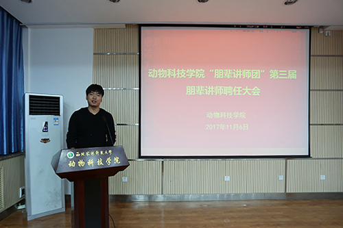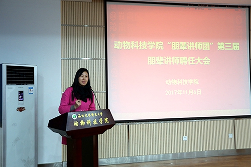 为了进一步加强学风建设工作,营造良好的舍风、院风,并带动优良的学风,助力人才培养质量的提高,充分发挥优秀学生的“朋辈”互助作用,动科学院继续开展学生“朋辈辅导”专题活动,并聘任新一届“朋辈讲师”。11月7日晚,动科学院于动科楼107会议室召开第三届“朋辈讲师团”聘任大会,聘任120名本科及研究生为动物科技学院“朋辈讲师团”第三届朋辈讲师。马克思主义学院副教授胡尊让老师、学工秘书胡巧娟、辅导员张士军、陈雅婷及“朋辈讲师”代表、学生代表出席并参加本次活动。马克思主义学院副教授胡尊让为新一届“朋辈讲师”代表颁发聘书。