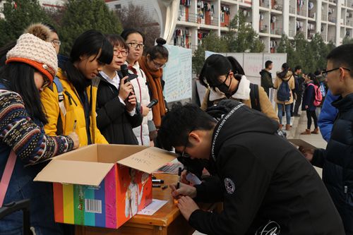 中午正值同学们下课时期,前来捐赠物资的人越来越多,社会实践部志愿者们虽然忙得不可开交,却都兴致勃勃地做着自己的工作,完全没有懈怠之意。志愿者们为了更好地为同学们服务,放弃了自己吃饭和休息的时间,坚守在自己的岗位上。虽然寒风在吹着,但活动现场的气氛是热烈的,志愿者们的心也是热的,她们并没有停止自己争取更多爱心人士参与到募捐活动中来的脚步。社会实践部的志愿者们用行动感染着在场的每一位同学,他们纷纷前来捐赠,奉献自己的一份爱心。
