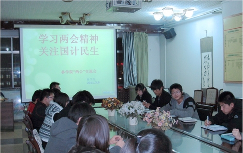 3月5日9时,十一届全国人民代表大会第四次会议在人民大会堂举行开幕会,林学院团工委、学生会学生干部和部分同学在网络上收看了视频直播,听取了国务院总理温家宝所作的政府工作报告。3月6日,学院召开了学生干部和学生代表学习“两会”交流会,广泛收集了同学们对“两会”报告的反映。